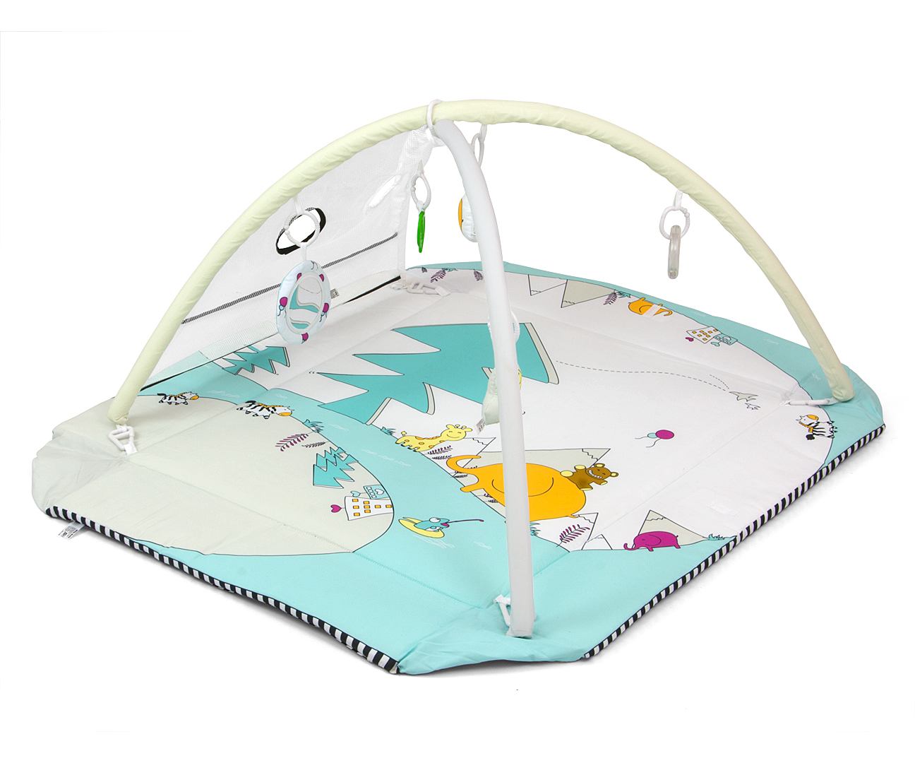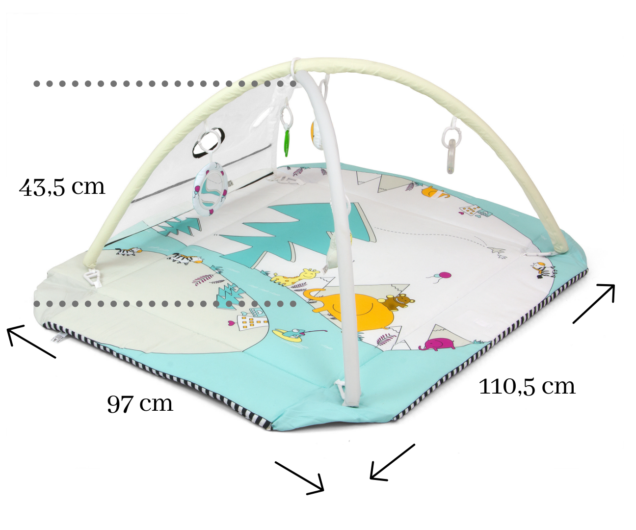 Złożone boki idealne dla najmłodszych dzieci zapewniają bezpieczną przestrzeń do zabawy lub snu. Pałąki mocowane są na zewnątrz maty za pomocą dodatkowych zaczepów umieszczonych w spodzie maty.