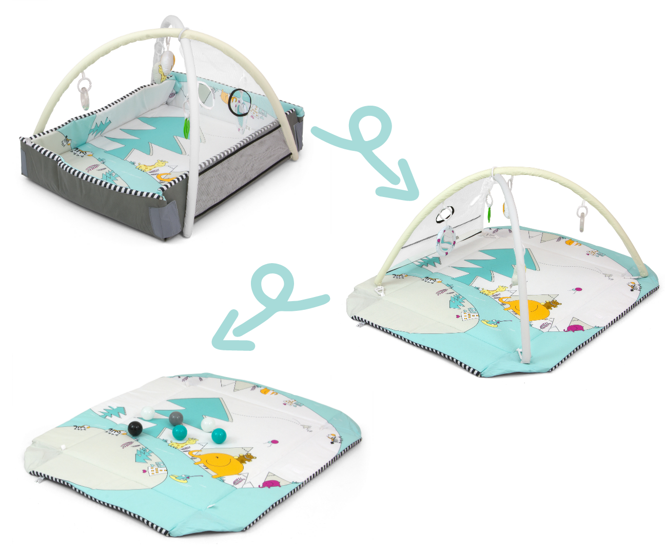 Rozłożone boki i pałąki – idealne dla maluszków które już się turlają i zaczynają raczkować. Natomiast 2 pałąki z możliwością przerzucania piłek przez siateczkę, uatrakcyjnią zabawę z dzieckiem.