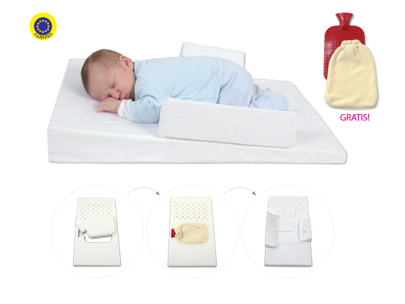 Materacyk dla noworodka w kształcie klina z termoforem łagodzącym kolki. Ogrzewa brzuszek, zapobiega zakrztuszeniu dzięki otworom wentylacyjnym. Regulowane ograniczniki gwarantują bezpieczną pozycję, a zdejmowany pokrowiec ułatwia higienę. Zapewnij maluchowi spokojny sen i ulgę w bólu!