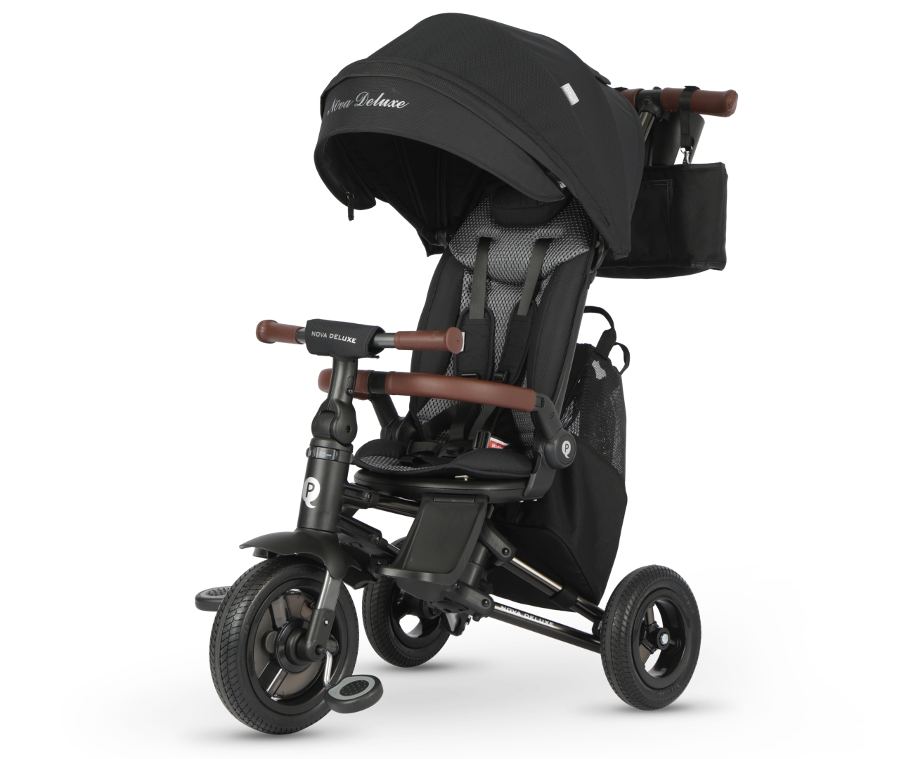 Qplay Rowerek Trójkołowy Nova Deluxe jest stabilny i bezpieczny, posiada nowoczesną aluminiową konstrukcję, wygodne wyprofilowane siedzisko ‘360’ które umożliwi podróż przodem lub tyłem do kierunku jazdy. Do jego montażu nie potrzeba narzędzi - system szybkiego składania pozwala złożyć rowerek w kilku prostych ruchach. Rowerek został wyposażony w barierkę zabezpieczającą dziecko przed wypadnięciem, pięciopunktowe pasy bezpieczeństwa oraz podnóżki. Po zdemontowaniu rączki sterowania, barierek, budki i pokrowca na siedzisko Qplay Rowerek Trójkołowy Nova Deluxe będzie służył jako klasyczna trójkołówka dla samodzielnego małego rowerzysty. Rowerek ten z pewnością zadowoli najbardziej wymagające gusty, firma QPLAY zastosowała najnowsze trendy w kolorystyce i stworzyła trójkołowca z ramą z efektownym skórzanym wykończeniem oraz dla podkreślenia design zastosowane zostały wszywki z logo i nazwą na budce oraz torbie. Wszystko dla zwiększenia jego atrakcyjności. Gumowe bezdętkowe kółka zapewniają komfort jazdy. Funkcje wolnego koła oraz wolnej kierownicy dają rodzicowi kontrolę aby spokojnie podążać wyznaczoną trasą. Skórzane wykończenia. Ręcznie szyty pałąk oraz uchwyt do prowadzenia pokryte miękką ekoskórą zapewniają wygodę i elegancki wygląd. Wykładany z daszka budki na barierki specjalny dodatkowy materiał chroniący/ zasłaniający prze promieniami UV. Oddychająca poduszka o anatomicznym kształcie. Zaprojektowana z myślą o wygodzie i lepszej cyrkulacji powietrza dziecka. Łatwa do złożenia konstrukcja modelu Qplay Nova Deluxe sprawia, że rowerek jest wyjątkowo wygodny w przenoszeniu. Wyposażona jest również w torbę na zakupy, torbę na pieluchy oraz uchwyt na kubek z przegrodą na telefon – idealne miejsce do przechowywania butelek z wodą, zabawek, przekąsek i chusteczek!