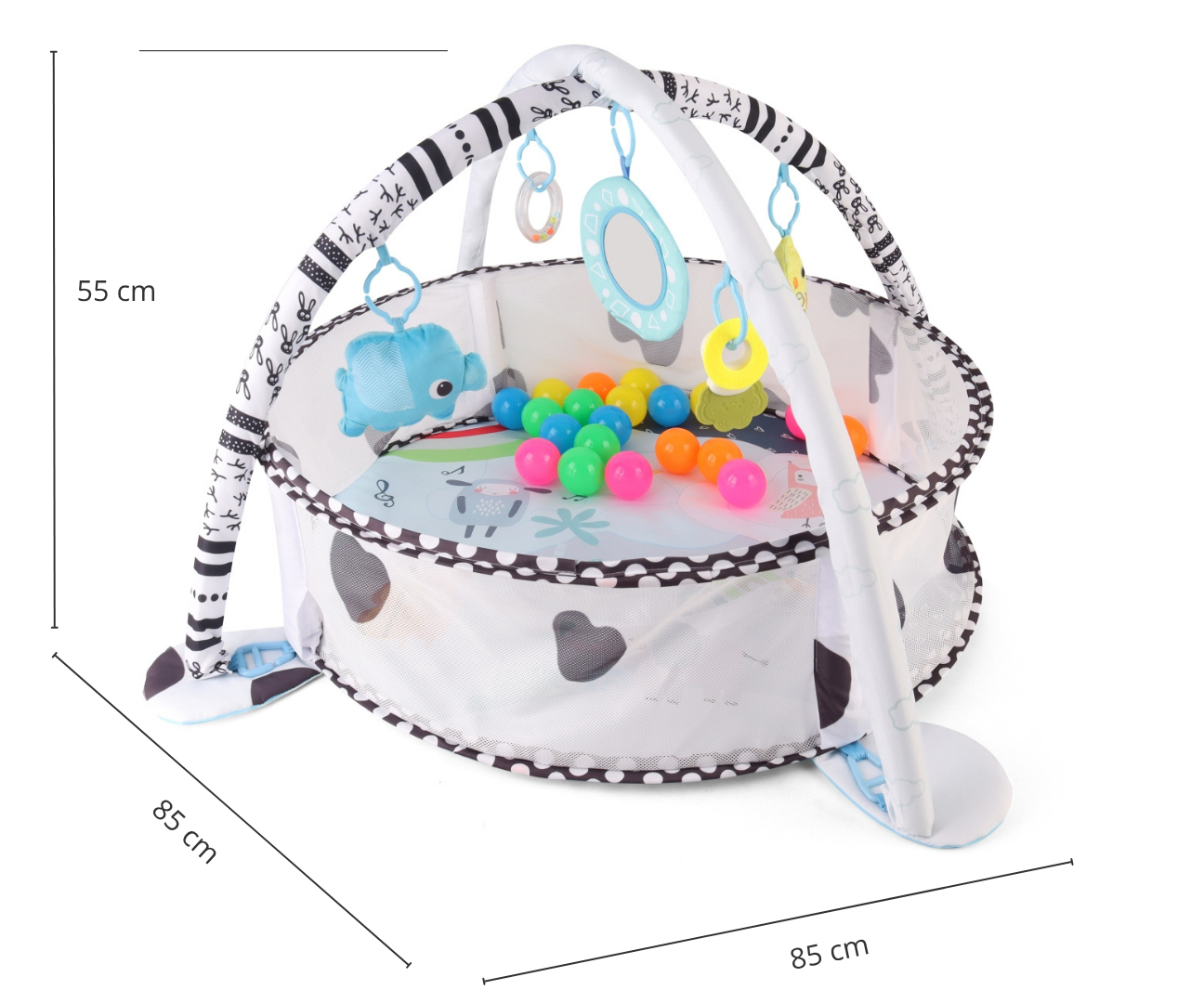 Kompletny zestaw do zabawy: Wraz z matą otrzymujesz 20 kolorowych piłeczek oraz zestaw interaktywnych zabawek: pluszowego słonia, żółtą kaczuszkę, grzechotkę, gryzak i pierścień sensoryczny. Wszystkie elementy, w tym bezpieczne lusterko, zostały zaprojektowane, by pobudzać zmysły, rozwijać koordynację wzrokowo-ruchową i wspierać samopoznanie.