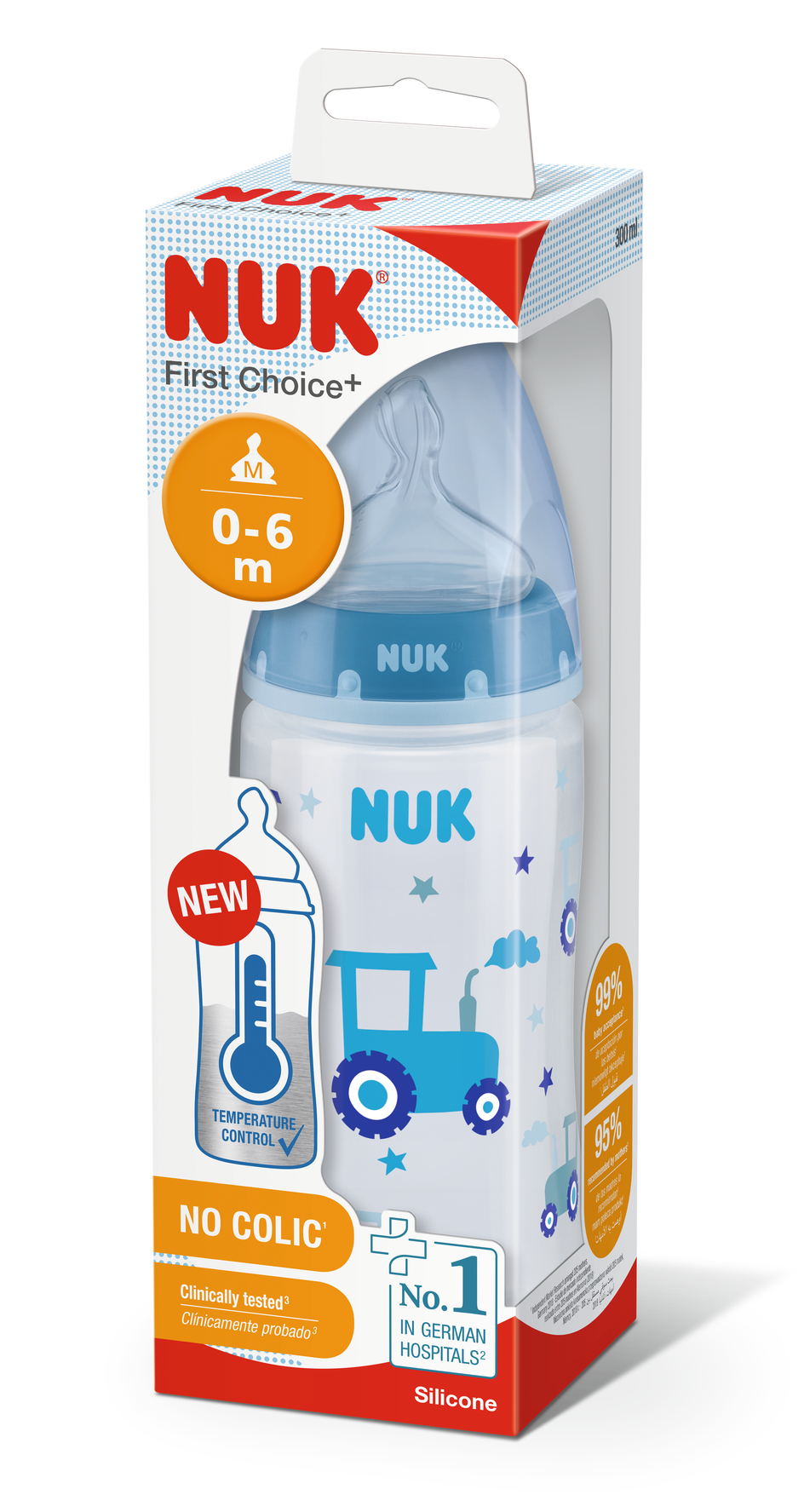 NUK Butelka First Choice+ 300ml to idealne rozwiązanie dla maluszków 6-18m. Posiada innowacyjny wskaźnik temperatury NUK, miękki silikonowy smoczek Flow Control do każdego pokarmu oraz antykolkowy system odpowietrzania. Szeroki otwór ułatwia czyszczenie. Bezpieczna, bez BPA, zaprojektowana dla komfortu karmienia.
