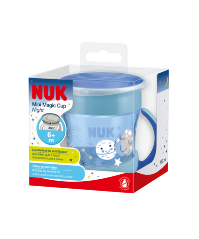 NUK Evolution Mini Magic Cup Night to innowacyjny kubek niekapek 360° dla dzieci od 6 miesięcy, który świeci w ciemności do 8 godzin! Ułatwia samodzielne picie bez rozlewania, dzięki specjalnemu ustnikowi i ergonomicznym uchwytom. Łatwy do czyszczenia (można myć w zmywarce) i wyposażony w praktyczną pokrywkę, idealny w domu i w podróży. Zapewnij maluchowi komfort i bezpieczeństwo, a sobie spokój!