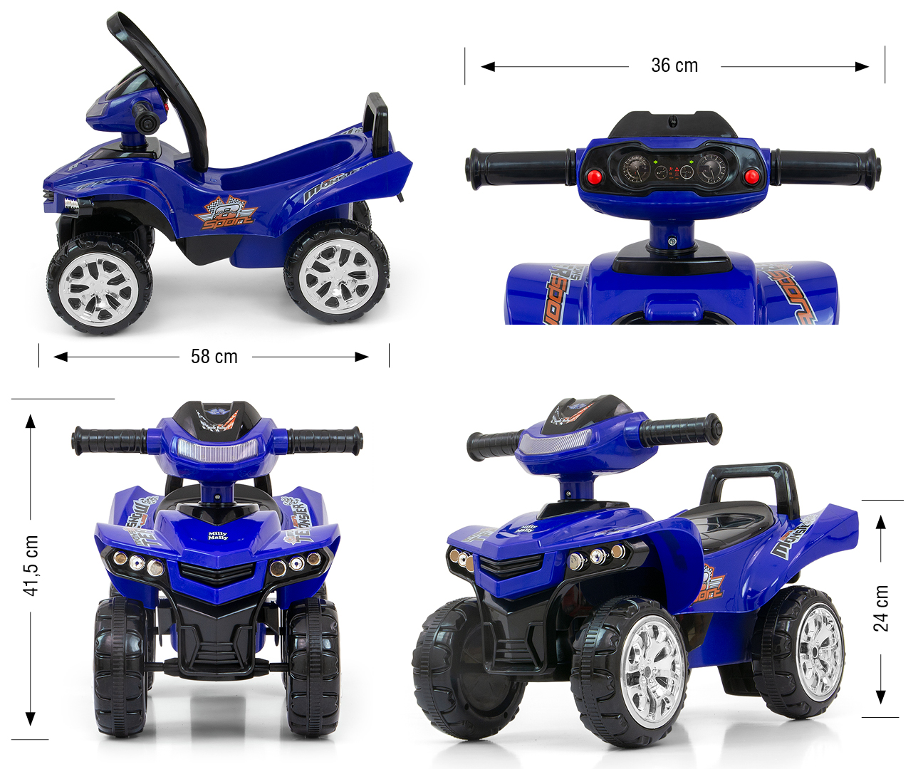 Przygotuj się na niezapomniane przygody z Quad jeździkiem Monster od Milly Mally! Ten dynamiczny pojazd w modnym granatowym kolorze to idealny towarzysz dla wszystkich małych odkrywców, którzy kochają ruch i zabawę zarówno w domu, jak i na świeżym powietrzu. Zaprojektowany z myślą o rozwijaniu koordynacji ruchowej i dostarczaniu mnóstwa radości, ten jeździk szybko stanie się ulubioną zabawką Twojego malucha.
