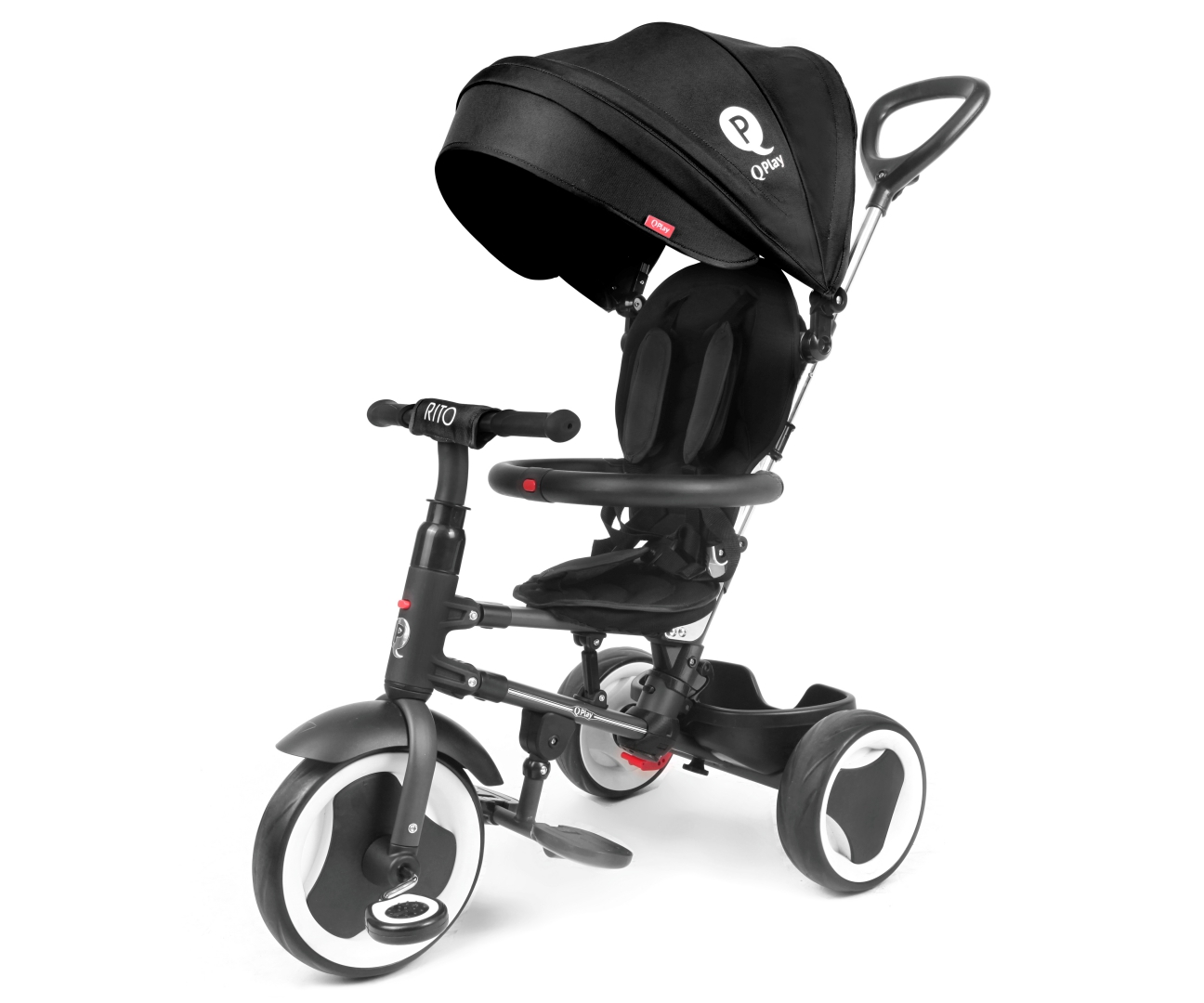 Rowerek trójkołowy Rito Deluxe Rubber czarny to gwarancja bezpieczeństwa i komfortu dla dziecka od 10 do 36 miesięcy. Dzięki funkcji GROW UP, stabilnej konstrukcji, nieprzebijanym kołom RUBBER oraz systemom „wolnego koła” i „wolnej kierownicy”, zapewnia radość z jazdy i wspiera rozwój. Posiada 5-punktowe pasy, regulowane siedzisko i praktyczne akcesoria. Składany do małych wymiarów. Spełnia normy UE.