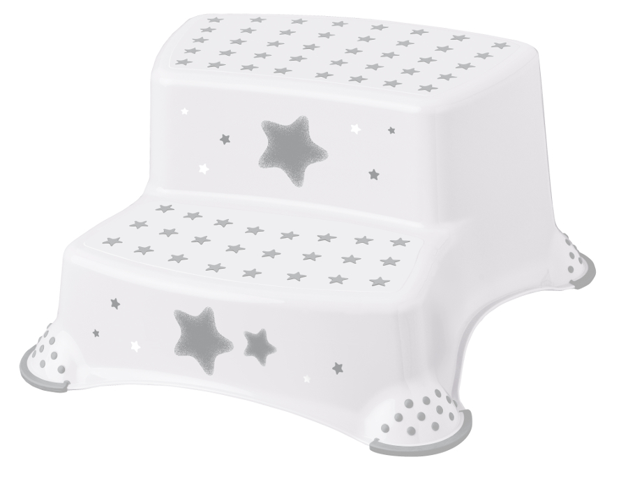 Antypoślizgowy podest dwustopniowy dla dzieci w kolorze białym z uroczymi gwiazdkami. Wspiera samodzielność malucha podczas mycia zębów i innych czynności, zapewniając bezpieczny i stabilny dostęp do wyższych miejsc. Idealny dla rozwijających się pociech, które pragną być niezależne. Wymiary: 40x37x21 cm.