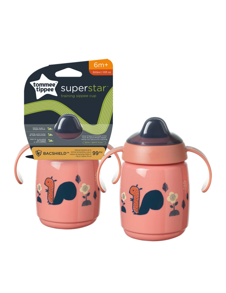 Kubek Tommee Tippee SUPERSTAR 300ml 6m+ z uchwytami to idealne rozwiązanie do nauki samodzielnego picia. Wyposażony w technologie INTELLIVALVE™ dla 100% szczelności i BACSHIELD™ dla ochrony antybakteryjnej ustnika. Bezpieczny, bez BPA, z łatwym do czyszczenia zaworem. Zaprojektowany dla komfortu i higieny malucha od 6. miesiąca życia.
